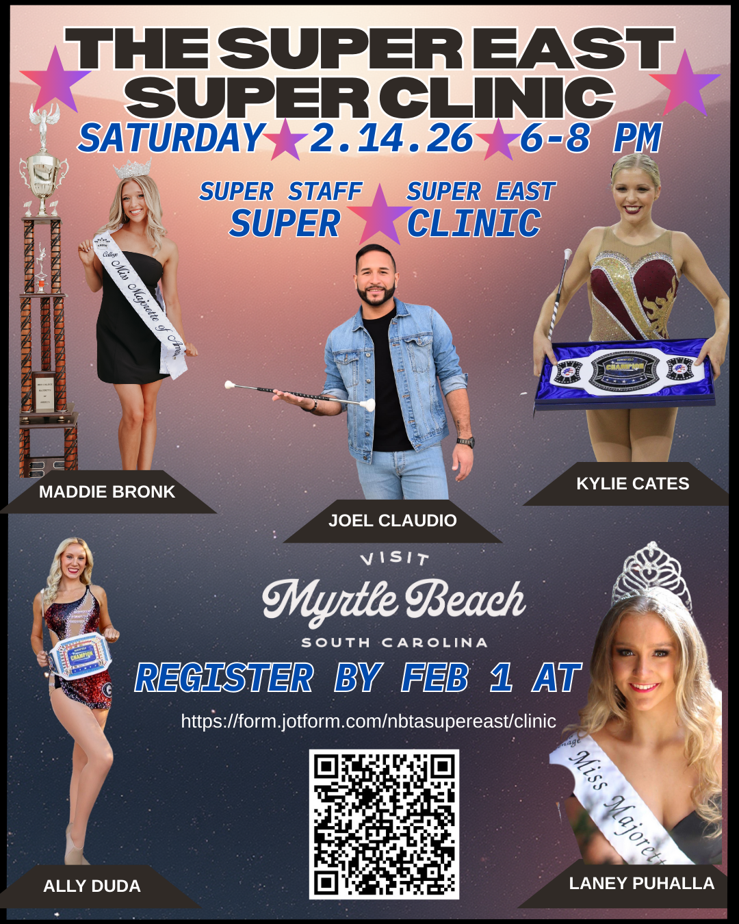 NBTA International is thrilled to introduce two brand new and exciting events: the Super East Regional - for competitors in states East of the Mississippi - and the Super West Regional - for competitors in states West of the Mississippi. Featuring new, major titles “Miss East of the Miss” and “Miss West of the Miss,” these events will be qualifiers for AYOP in Miss Majorette, National Majorette, National Rhythmic Championships, and Beginner & Intermediate Pageants.